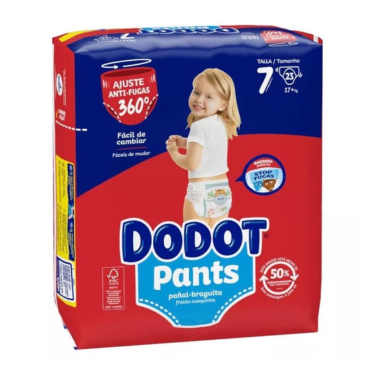 Slip per pannolini regolabili con sistema anti-perdita. Confezione da 23 pannolini, taglia 7. Favorisce la mobilità e il comfort dei più piccoli. La loro grande capacità di assorbimento li rende adatti all'uso durante il giorno e la notte. Adatto a bambini di oltre 17 kg.