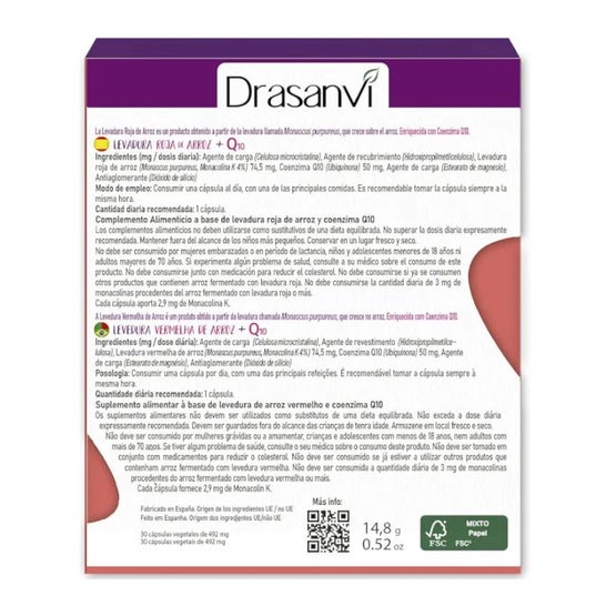 Drasanvi Red Yeast Rice + Q10 30caps è un integratore alimentare a base di ingredienti biologici, che contribuisce al mantenimento di una buona salute digestiva. Contiene monacolina K da lievito di riso rosso, coenzima Q10, magnesio e silicio, che agiscono per mantenere normali livelli di colesterolo nel sangue e promuovere la funzione epatica. Facilita l'eliminazione delle tossine con un effetto diuretico. Aiuta a rafforzare la barriera protettiva della pelle e delle mucose.