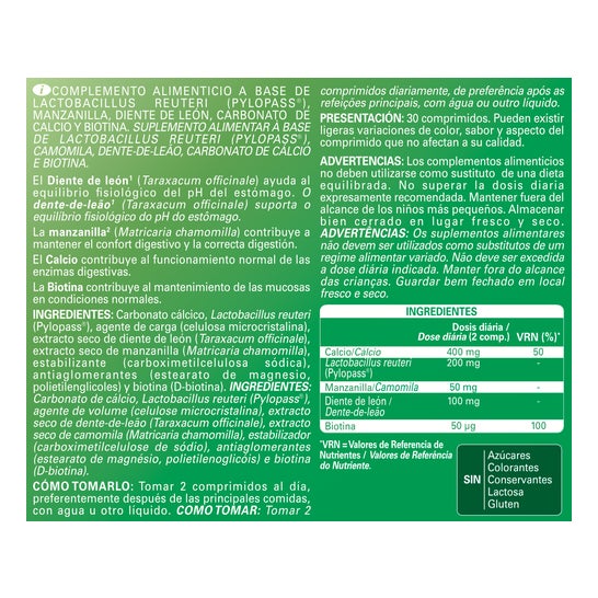 CÁLCICO CARBONATO, LACTOBACILLUS REUTERI (PYLOPASS®), CELULOSA MICROCRISTALINA (AGENTE DE CARGA), ALMIDÓN DE MAÍZ PREGELATINIZADO (ANTIAGLOMERANTE), EXTRACTO DE FLORES SECAS DE MANZANILLA (MATRICARIA CHAMOMILLA), CROSCARMELOSA SÓDICA (ESTABILIZANTE), ESTEARATO DE MAGNESIO (ANTIAGLOMERANTE), POLIETILENGLICOL 6000 (ANTIAGLOMERANTE) Y BIOTINA.