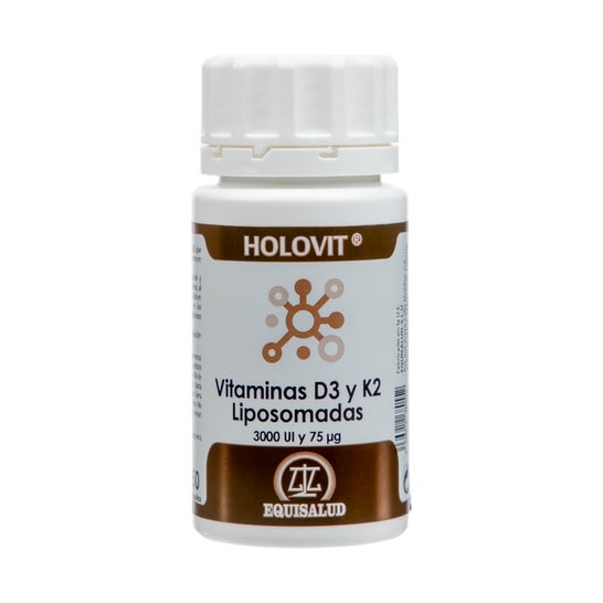 Equisalud Holovit Vitamine D3 e K2 Lipos 3000 Ui e 75 Mcg 50 caps è un integratore che combina due vitamine essenziali per l'organismo.