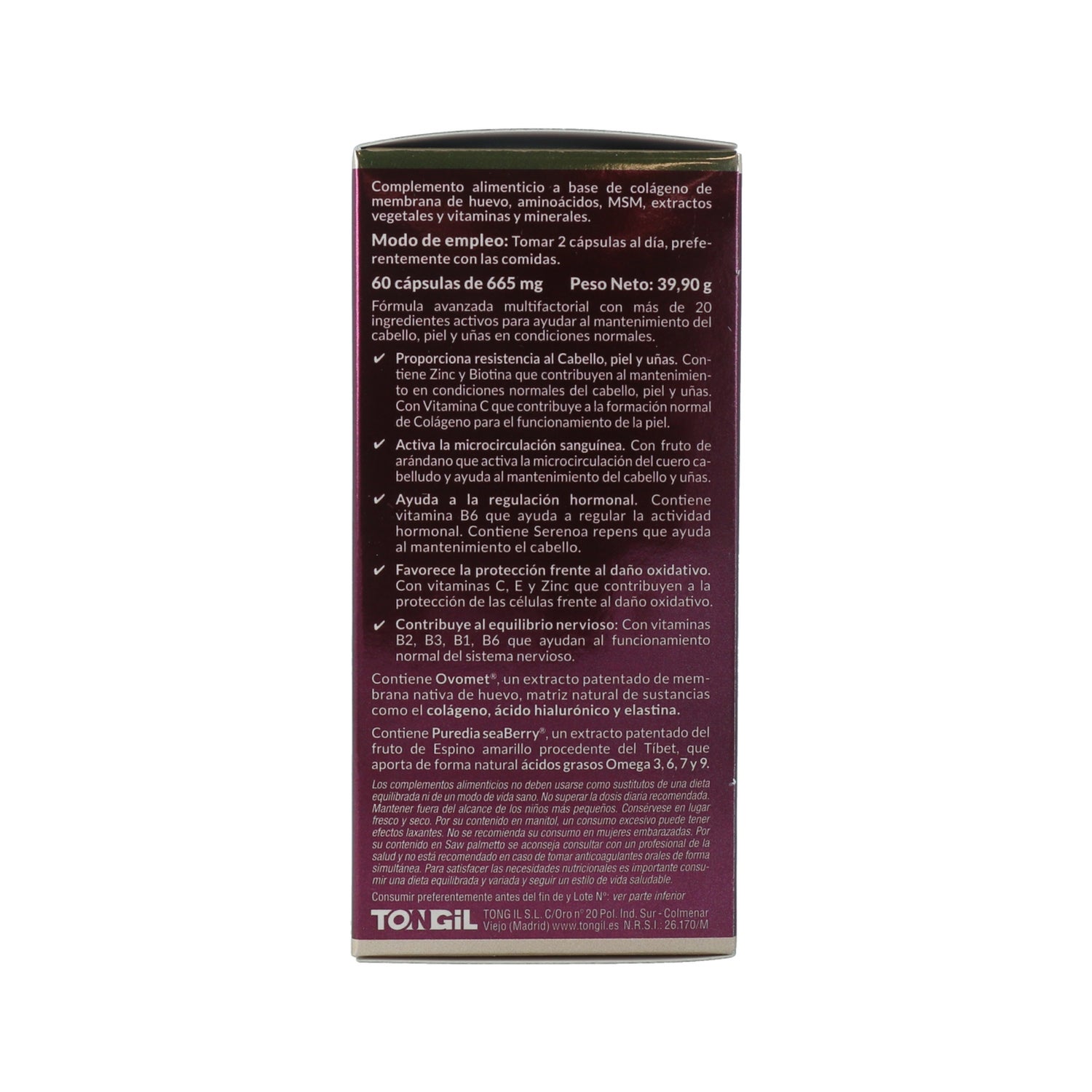 Tongil Pure State Hair Skin & Nails Clinic 60caps è un integratore alimentare in capsule che contribuisce al mantenimento di capelli, pelle e unghie normali. La sua formula contiene più di 20 principi attivi, tra cui il collagene di Ovomel, un estratto brevettato della membrana nativa dell'uovo che fornisce collagene, acido ialuronico ed elastina. Contiene inoltre Puredia seaBerry, un estratto brevettato del frutto dell'olivello spinoso che fornisce acidi grassi omega 3, 6, 7 e 9.