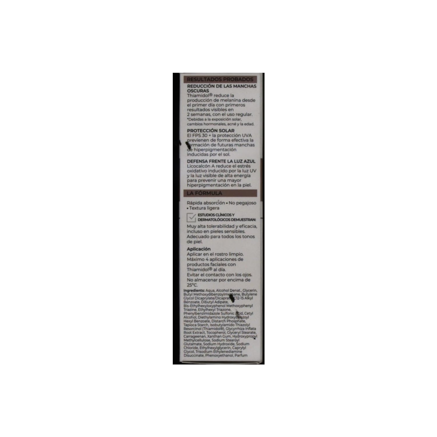 La sua formula contiene anche Thiamidol, che agisce alla fonte dell'iperpigmentazione per inibire la produzione di melanina, così come un complesso antiossidante per neutralizzare l' attività dei radicali liberi