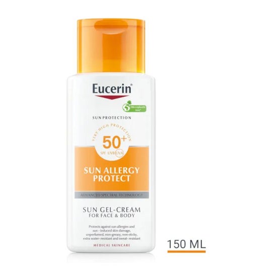 Eucerin Sun Allergy Protect Gel-Cream SPF50+ 150ml è un fotoprotettore in crema-gel che fornisce un'elevata protezione UVA/UVB. Questo trattamento è stato appositamente studiato per proteggere la pelle con allergie solari come la fotodermatosi polimorfa (PLE) e l'acne estiva.