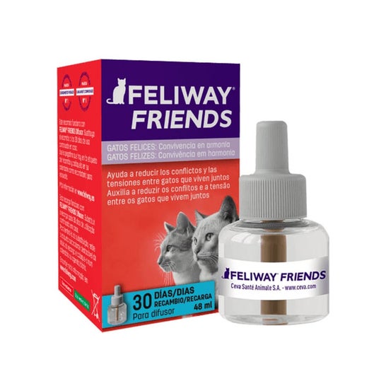 Ricarica per il diffusore Feliway® Ceva, a base di analoghi dei feromoni felini rilasciati dalla madre dopo il parto. Aiuta a migliorare il comportamento dei felini quando ce n'è più di uno nella stessa casa, facendoli sentire a loro agio e senza stress, e prevenendo comportamenti come la marcatura dell'urina o il graffiare i mobili di casa.