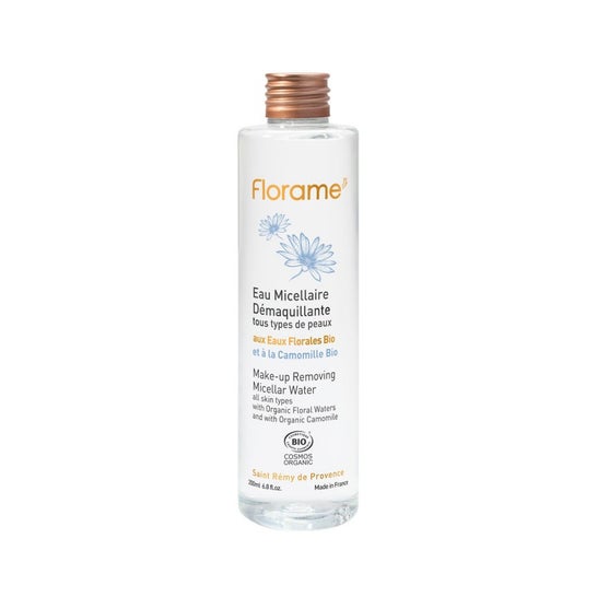Acqua micellare biologica di Florame, formulata a base di acque floreali calmanti, tonificanti e rinfrescanti. La ricca e delicata composizione è adatta per l'applicazione su pelli secche, pelli grasse, normali a miste, sensibili o mature. Il prodotto contribuisce a uno struccaggio efficace, facile e rapido. Rimuove delicatamente trucco, polvere e particelle (inquinamento) e impurità (sebo, sudore, desquamazione). Non contiene parabeni, solfati né sostanze nocive. Formato di presentazione: confezione da 200 ml.