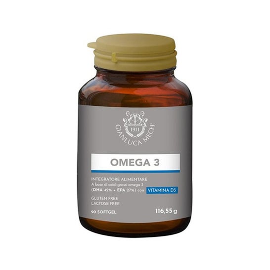 Integratore alimentare a base di omega 3 di Gianluca Mech, presentato in 90 perle, una selezione di EPA e DHA (DHA 42% + EPA 27%) di straordinaria purezza e concentrazione, con Vitamina D3. L'integratore di omega 3 per migliorare la funzione cardiaca, la capacità visiva, normalizzare i livelli di trigliceridi, la salute delle ossa e la funzione cerebrale. Formula adatta alle donne in gravidanza o in allattamento. Utilizzato nelle fasi di fertilità, protezione antivirale, potente antiossidante e molto altro ancora come fonte naturale di benessere.