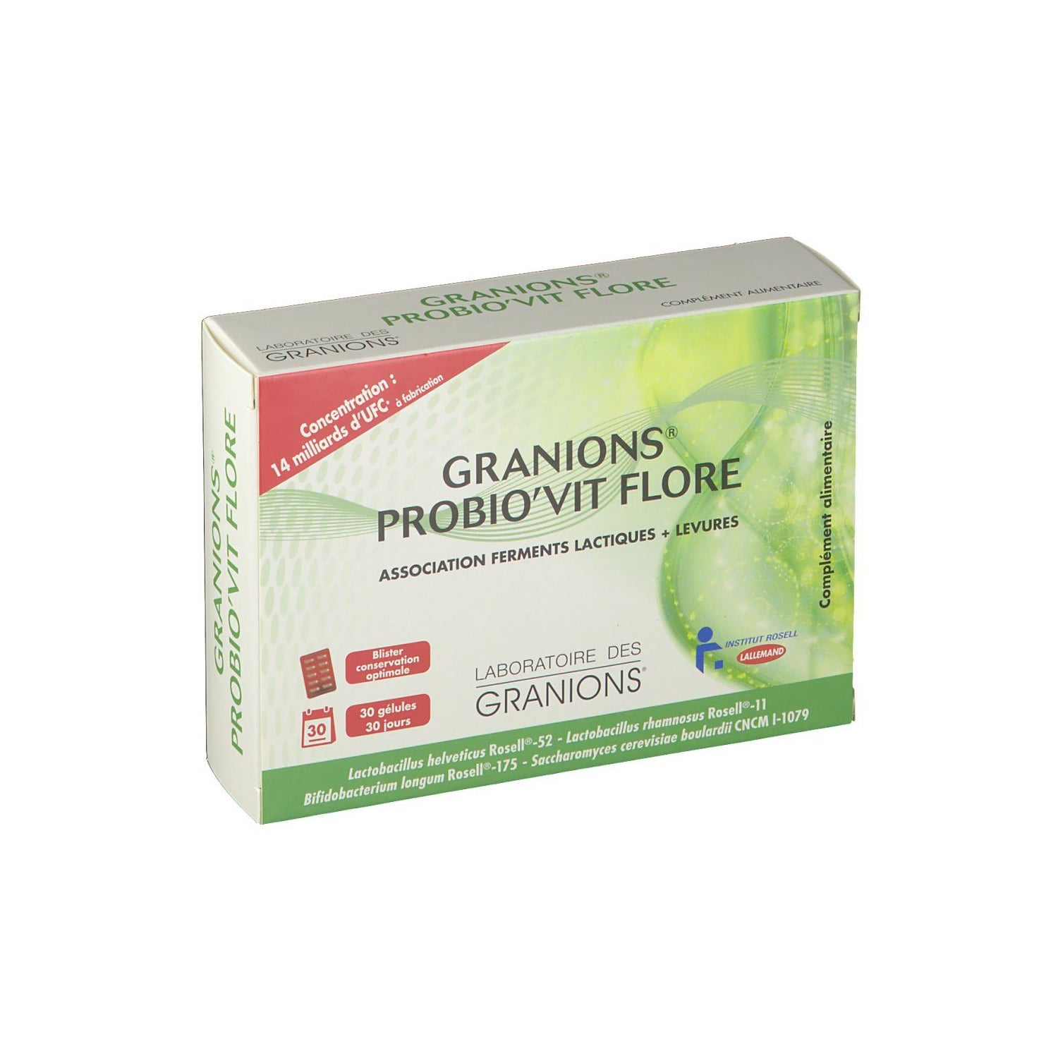 Con un'esperienza farmaceutica che risale al 1948, il Laboratoire des GRANIONS® ha sviluppato GRANIONS® PROBIO'VIT FLORE, una formula unica con 14 miliardi di CFU* di fermenti lattici e lieviti per capsula. GRANIONS® PROBIO'VIT FLORE offre una combinazione sinergica di diversi ceppi: - Lactobacillus helveticus Rosell® 52- Lactobacillus rhamnosus Rosell® 11- Bi?dobacterium longum Rosell® 175- Saccharomyces cerevisiae boulardii CNCM l-1079