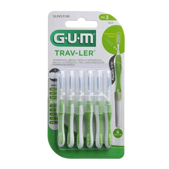 GUM Trav-Ler Spazzolino Interdentale 1.1mm 4pz è uno spazzolino interdentale con filamenti coperti da clorexidina, che permette di prevenire batteri, una testina che può ruotare fino a 90º e un manico smontabile che funge anche da cappuccio.