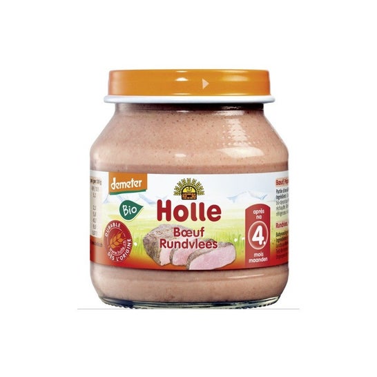 Alimento infantile presentato in un vasetto di vetro, che è preparato a base di carne di manzo con origine 100% Bio proveniente dall'agricoltura biologica senza coloranti né conservanti, adatto per bambini a partire dai 4 mesi di età.