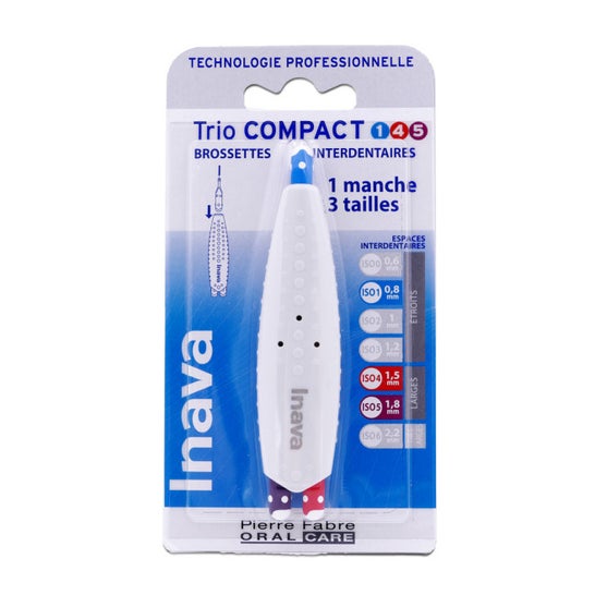 Il suo formato compatto e la varietà di dimensioni consentono di accedere facilmente alle aree più difficili della bocca. L'innovativo design di Inava Trio Compact Spazzolini Interdentali 1/4/5 facilita l'eliminazione di residui di cibo e placca batterica, dove lo spazzolino da denti convenzionale non arriva.