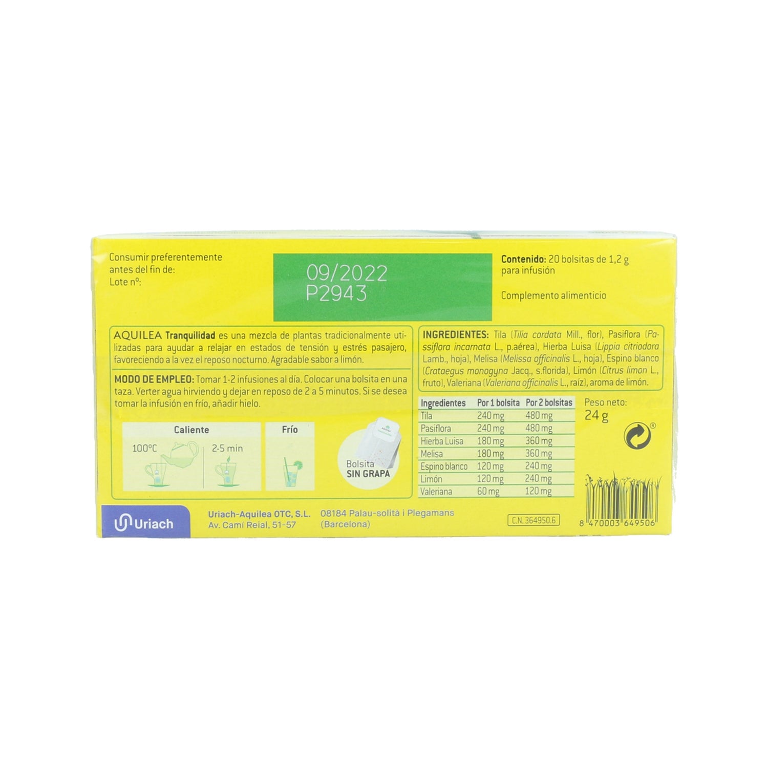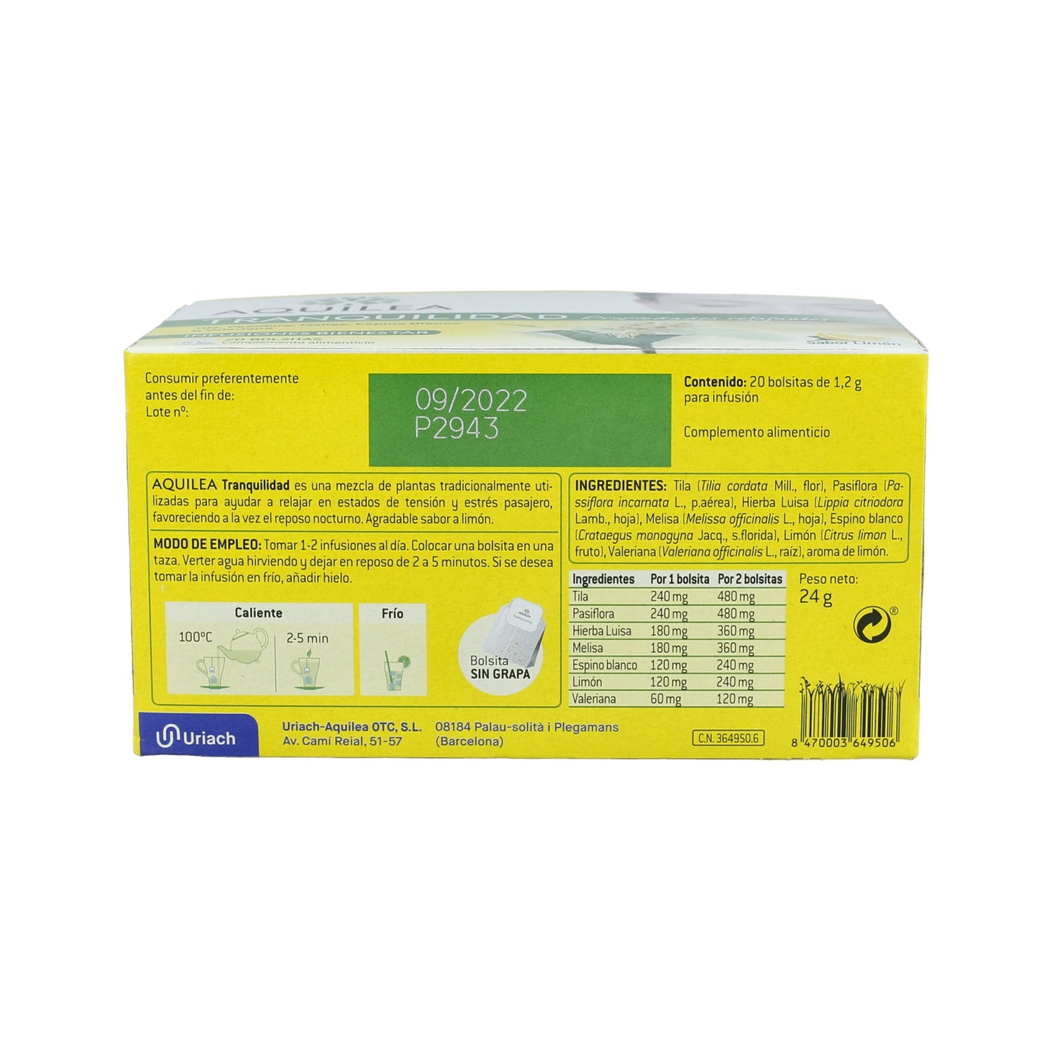 FIORI DI TIGLIO (TILIA CORDATA MILL., FIORE) 20%, PASSIFLORA (PASSIFLORA INCARNATA L., P.AÉRIA) 20%, VERBENA LIMONE (LIPPIA CITRIODORA H.B. ET K., FOGLIA) 15%, MELISSA (MELISSA OFFICINALIS L., FOGLIA) 15%, BIANCOSPINO (CRATAEGUS MONOGYNA JACQ., S.FLORIDA) 10%, LIMONE (CITRUS LIMÓN L., CORTECCIA) 10%. VALERIANA (VALERIANA OFFICINALIS L., RADICE E RIZOMA) 5%, AROMA DI LIMONE.