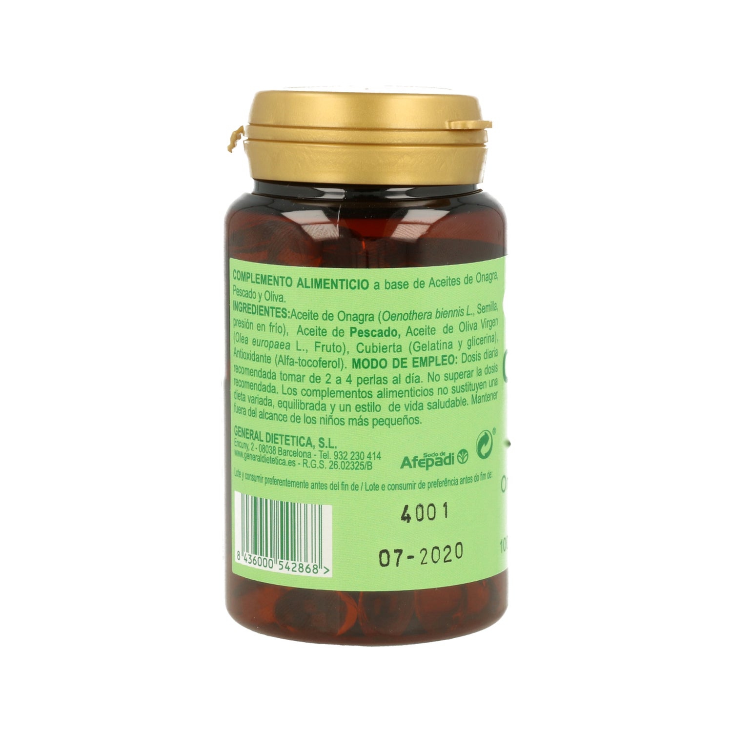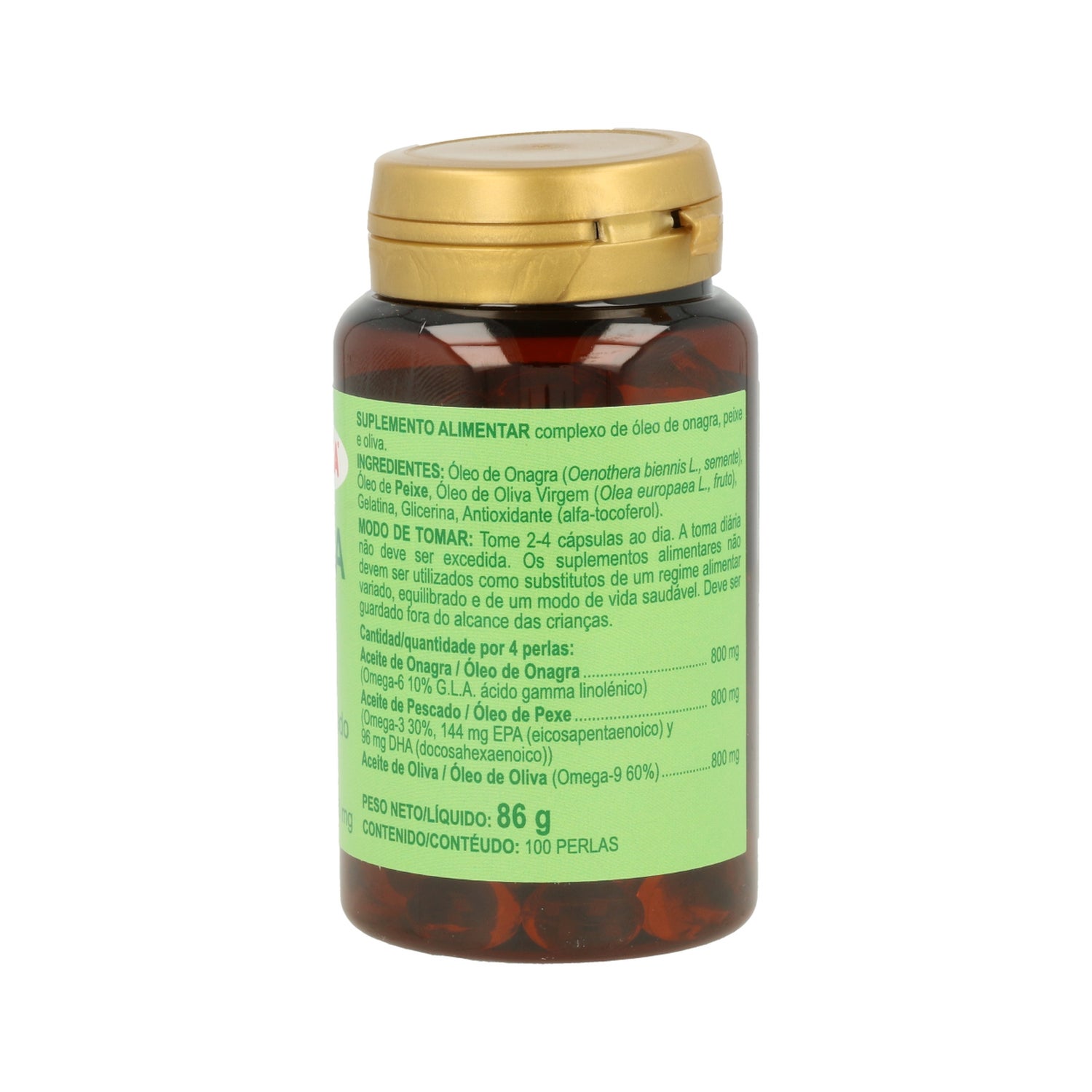 Integratore alimentare in forma di perle morbide, a base di oli di pesce, enotera e oliva, che forniscono un'elevata quantità di acidi grassi omega 3, 6 e 9. Contribuisce alla salute del sistema circolatorio e cardiovascolare, aiuta a proteggere la vista, rafforza il sistema immunitario e previene i dolori articolari, tra le altre cose. È inoltre molto benefico per la pelle e i capelli e aiuta a regolare il colesterolo.