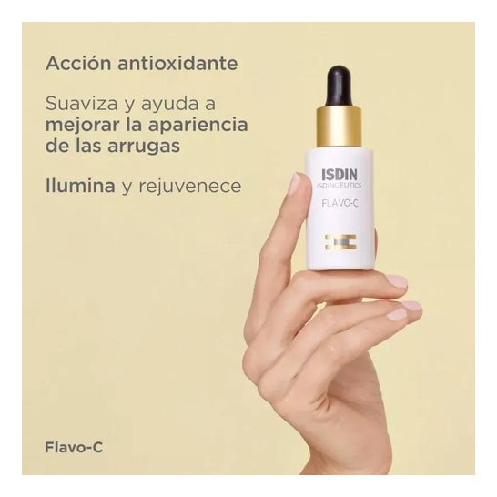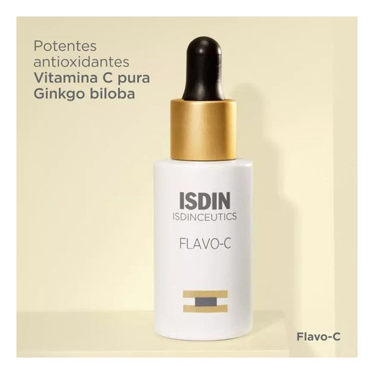 ISDIN Flavo-C è un siero antiossidante con vitamina C e ginkgo biloba formulato per ridurre i segni dell’invecchiamento dalla pelle e combattere i radicali liberi.