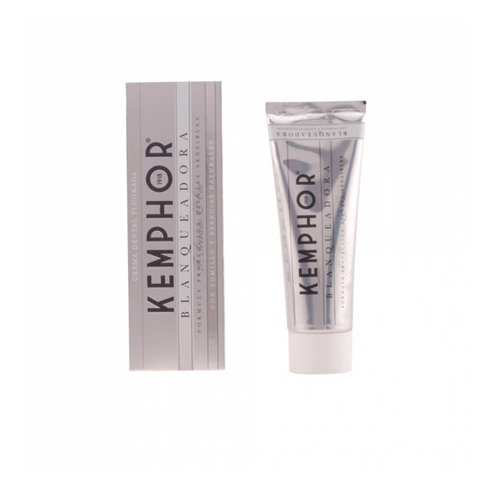 Kemphor Tooth Whitening Cream 75ml dentifricio sbiancante. è formulato con timo ed essenze naturali che lo rendono adatto ai denti sensibili. pulisce delicatamente le macchie e i residui di cibo. ripristina il bianco naturale dei denti. migliora la sensibilità al freddo e al caldo, ai cibi acidi o agli zuccheri. il suo uso protegge lo smalto e le gengive. ha azione anti tartaro.