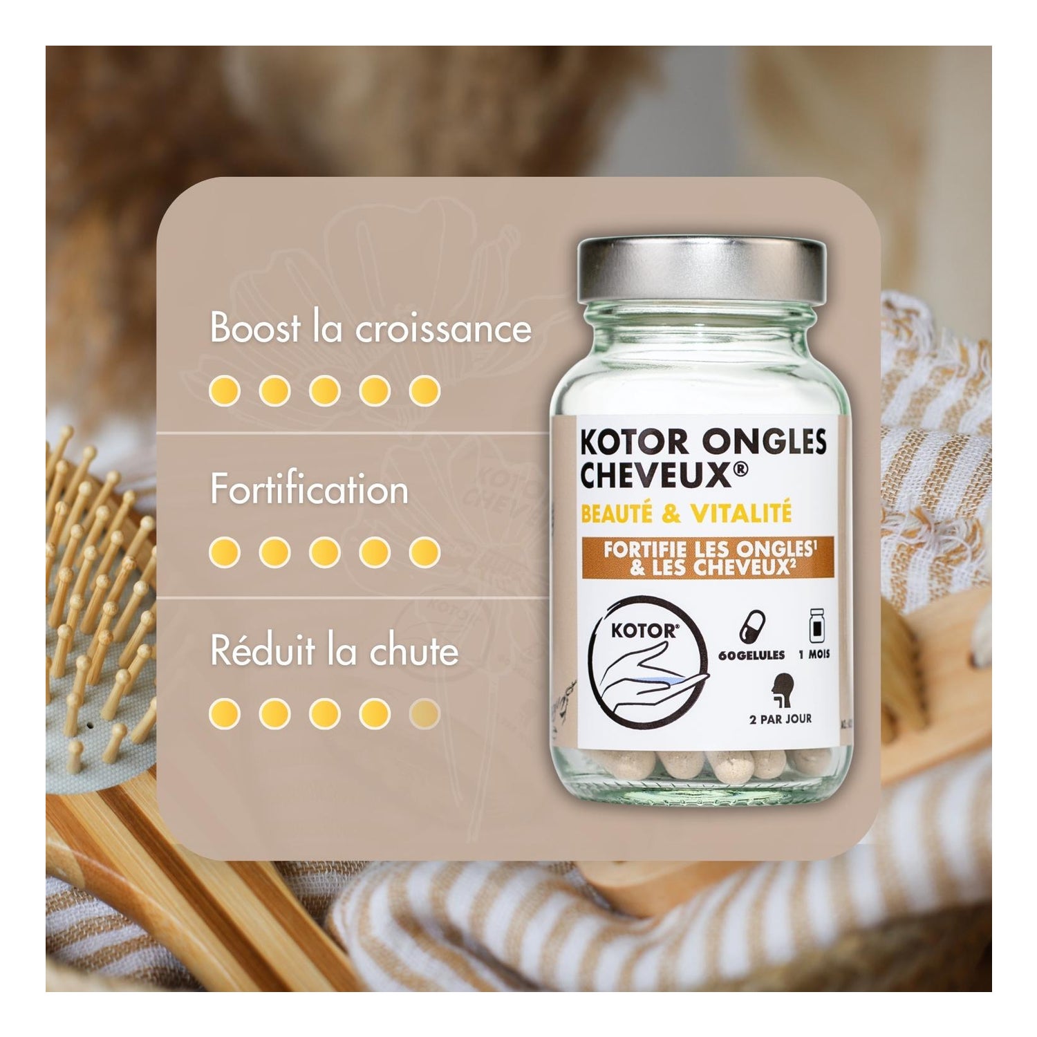 Kotor Unghie Capillari 60 Perle è un integratore alimentare che restituisce forza e lucentezza ai phanères. La vitamina B5 e la biotina favoriscono la crescita dei capelli, mentre il lievito di birra e il germe di grano, ricchi di aminoacidi e vitamine B, li nutrono in profondità.