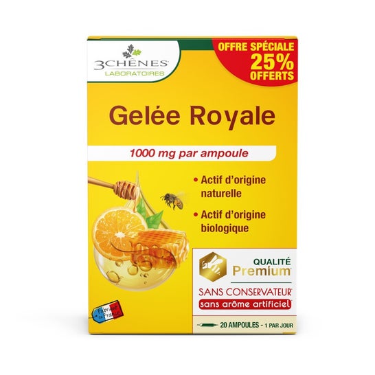 Les 3 Chenes Jalea Real 1000mg 20x10ml è un integratore alimentare presentato sotto forma di fiale bevibili, realizzato a partire da gelatina reale pura. Questo prodotto è conosciuto per la sua ricchezza in: