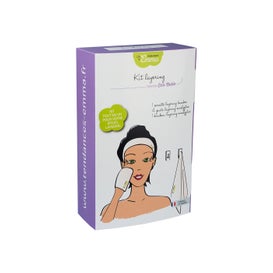 Kit contenente tutti gli accessori necessari per facilitare il processo di rimozione del trucco. Include una fascia elastica per rimuovere i peli dal viso, guanti con essenza di eucalipto che forniscono freschezza immediata e un asciugamano in bambù, con proprietà altamente assorbenti. Tutto lavabile e riutilizzabile per ridurre l'impatto ambientale.