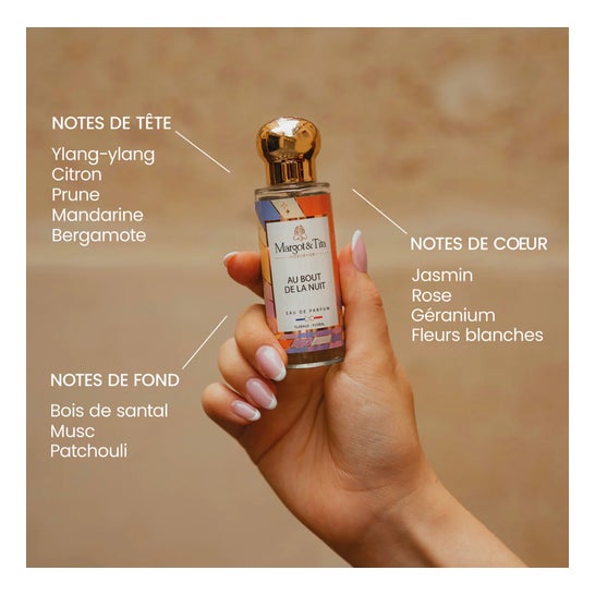 Margot & Tita Au Bout de la Nuit Eau de Parfum 30ml è un'eau de parfum floreale e avvolgente, che mescola la delicatezza della rosa e del gelsomino con la profondità del muschio.