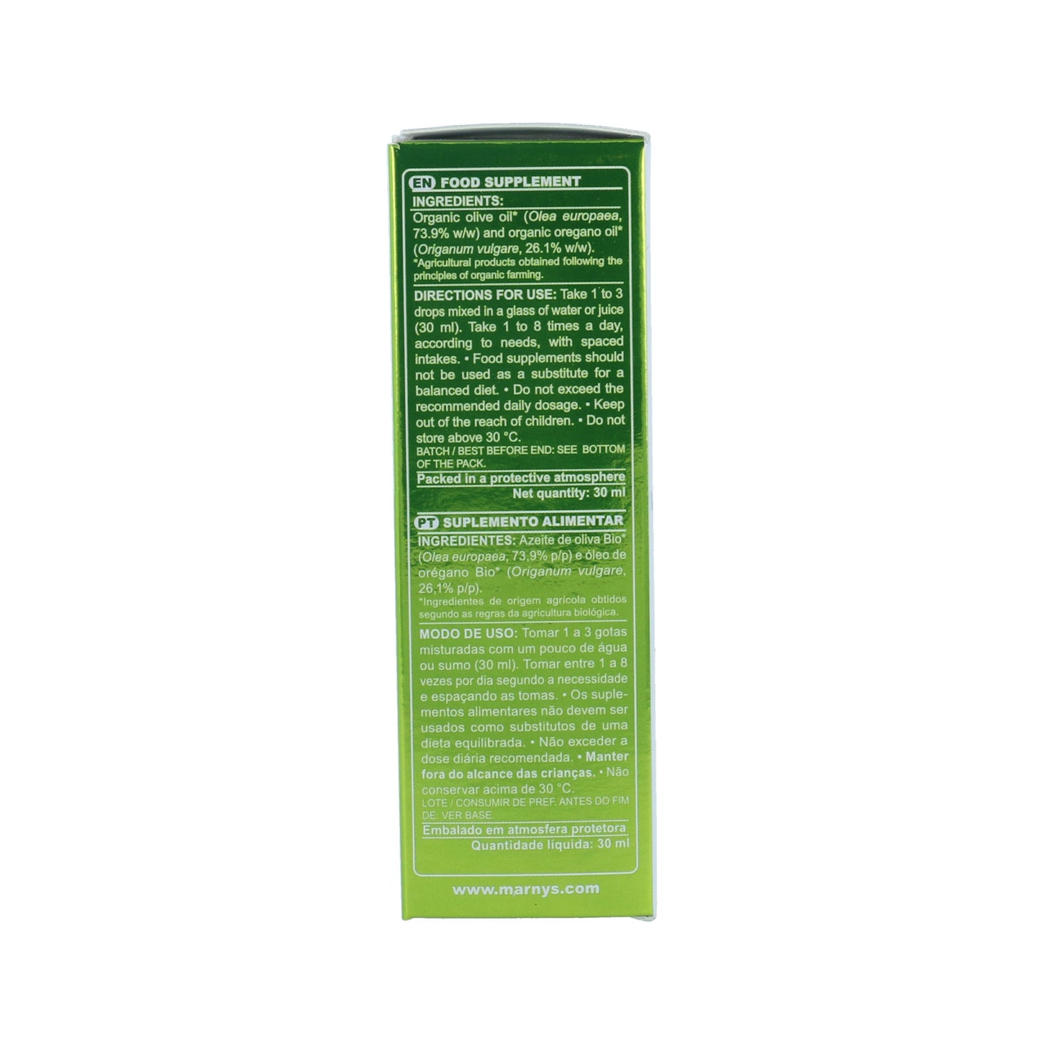 L'olio di origano Marnys è un prodotto realizzato con ingredienti al 100% da agricoltura biologica, che ne garantiscono la purezza e la qualità. È ottenuto da puro olio di origano mediterraneo (Origanum minutiflorum) e si distingue per l'elevato contenuto di principi attivi come il carvacrolo e il timolo, che hanno proprietà antisettiche e antibiotiche