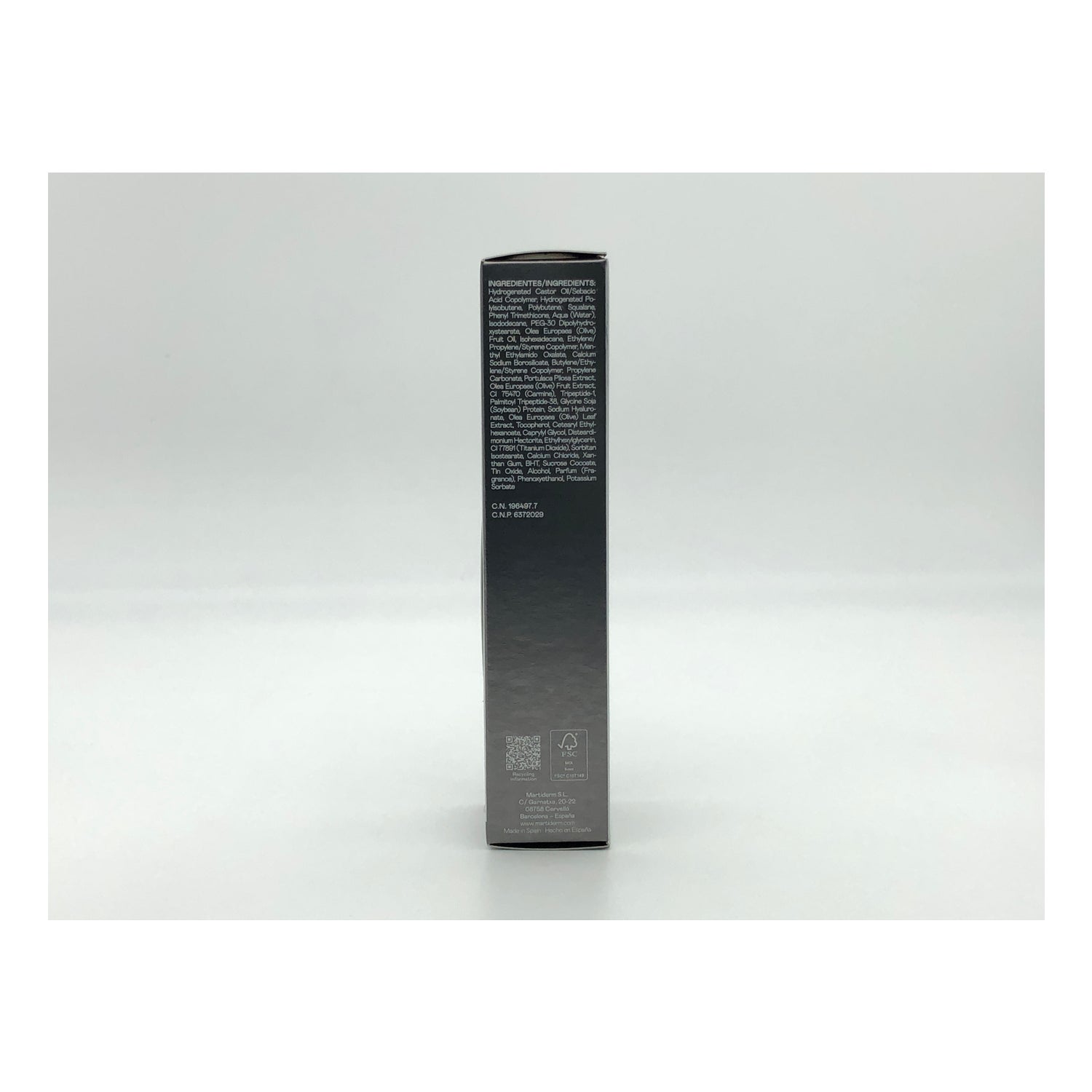 INCI: Copolimero olio di ricino idrogenato/acido sebacico, poliisobutene idrogenato, polibutene, squalane, fenil-trimeticone, proteina di glicina soja (soia), isododecano, olio di frutta di Olea Europaea (oliva), Isohexadecane, Copolimero Etilene/Propilene/Stirene, Copolimero Butilene/Etilene/Stirene, Menthyl Ethylamido Oxalate, Borosilicato di Calcio Sodico, Carbonato di Propilene, Estratto di Portulaca Pilosa, Estratto di frutta di Olea Europaea (oliva), CI 75470 (carminio), Tripeptide-1, Palmitoyl Tripeptide-38, Sodium Hyaluronate, Estratto di foglie di Olea Europaea (oliva), Cetearyl Ethylhexanoate, Disteardimonium Hectorite, CI 77891 (biossido di titanio), isostearato di sorbitano, gomma xantana, acqua, BHT, ossido di stagno, alcool, saccarosio, fenossietanolo