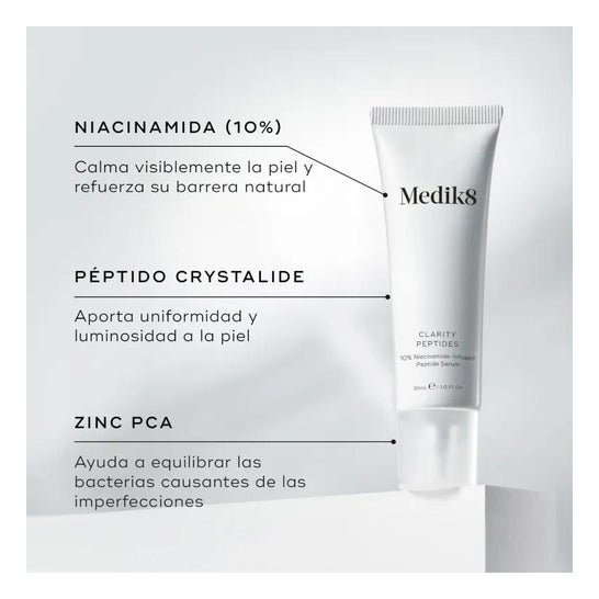 Siero multieffetto con proprietà schiarenti e lenitive. Formulato con niacinamide, zinco, acido ialuronico e peptidi di cristallo. Aiuta a neutralizzare l'iperpigmentazione del viso e le eruzioni acneiche, favorendo un viso idratato e di tono uniforme. I suoi componenti hanno proprietà antiossidanti che ritardano l'insorgenza dei segni dell'invecchiamento. Senza alcol, parabeni né fragranza. Prodotto non testato sugli animali. Raccomandato per pelli sensibili o arrossate.