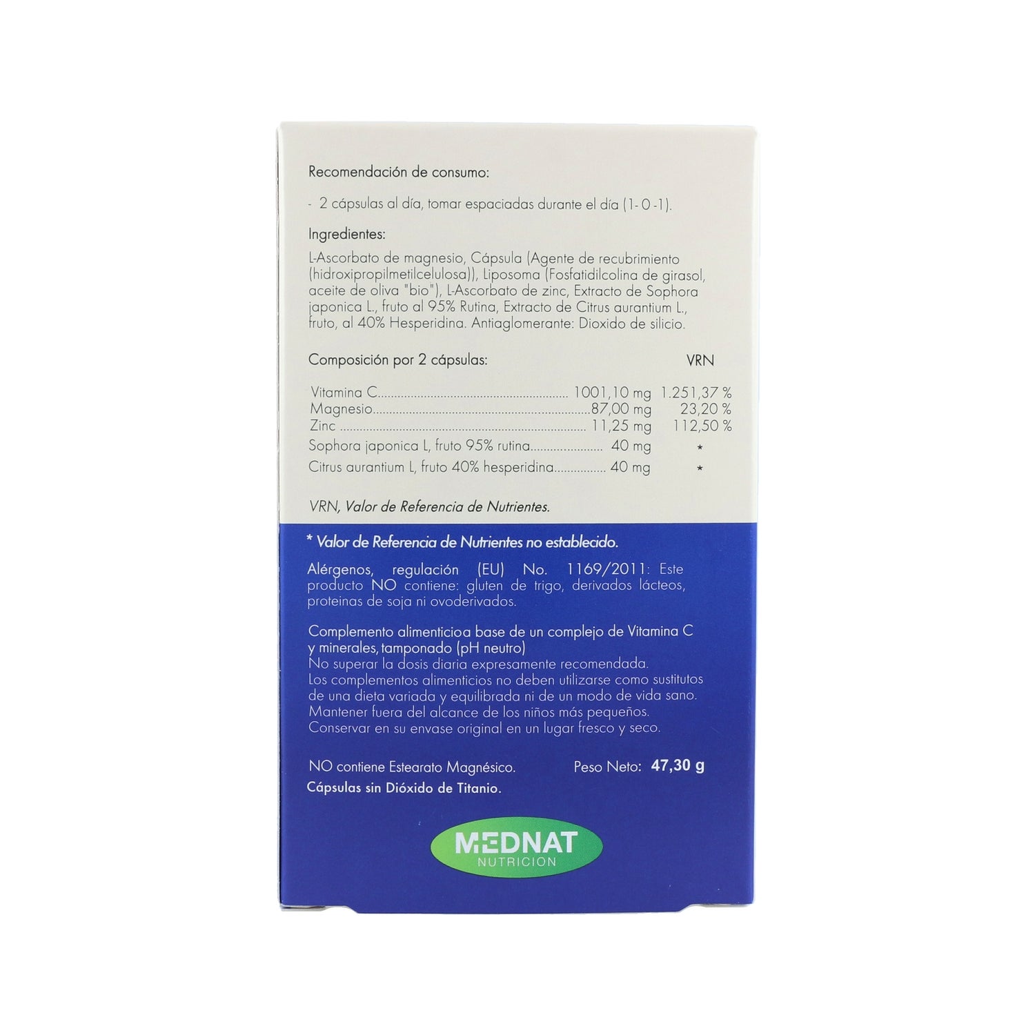 Integratore alimentare a base di vitamina C a pH neutro, nanoparticelle lipidiche, magnesio e zinco. Aiuta il corretto funzionamento del sistema immunitario e migliora l'assorbimento del ferro. Favorisce la produzione naturale di collagene, rafforzando la struttura dei vasi sanguigni, ossa, cartilagini, gengive, pelle e denti. Contribuisce a mantenere una normale funzione psicologica, mentre promuove la protezione delle cellule dai danni ossidativi. Non contiene glutine. Adatto ai vegani.