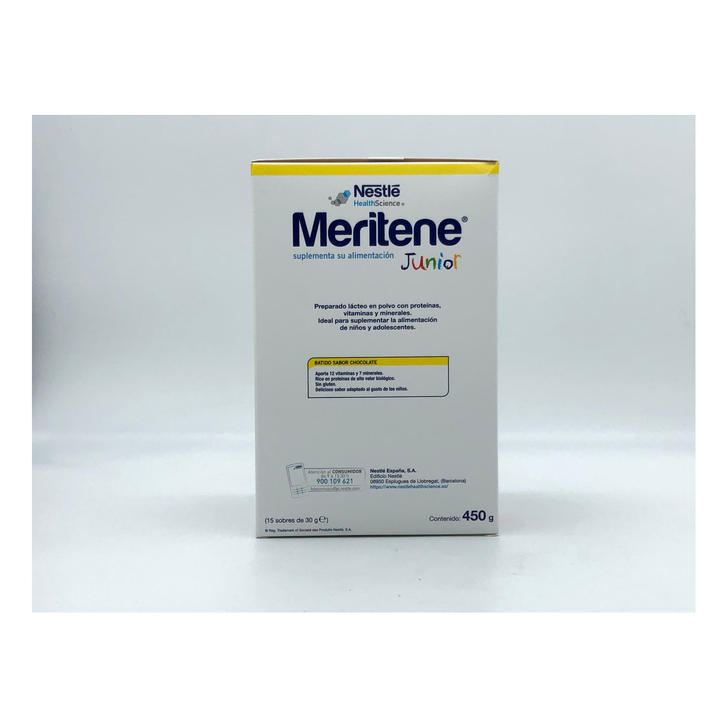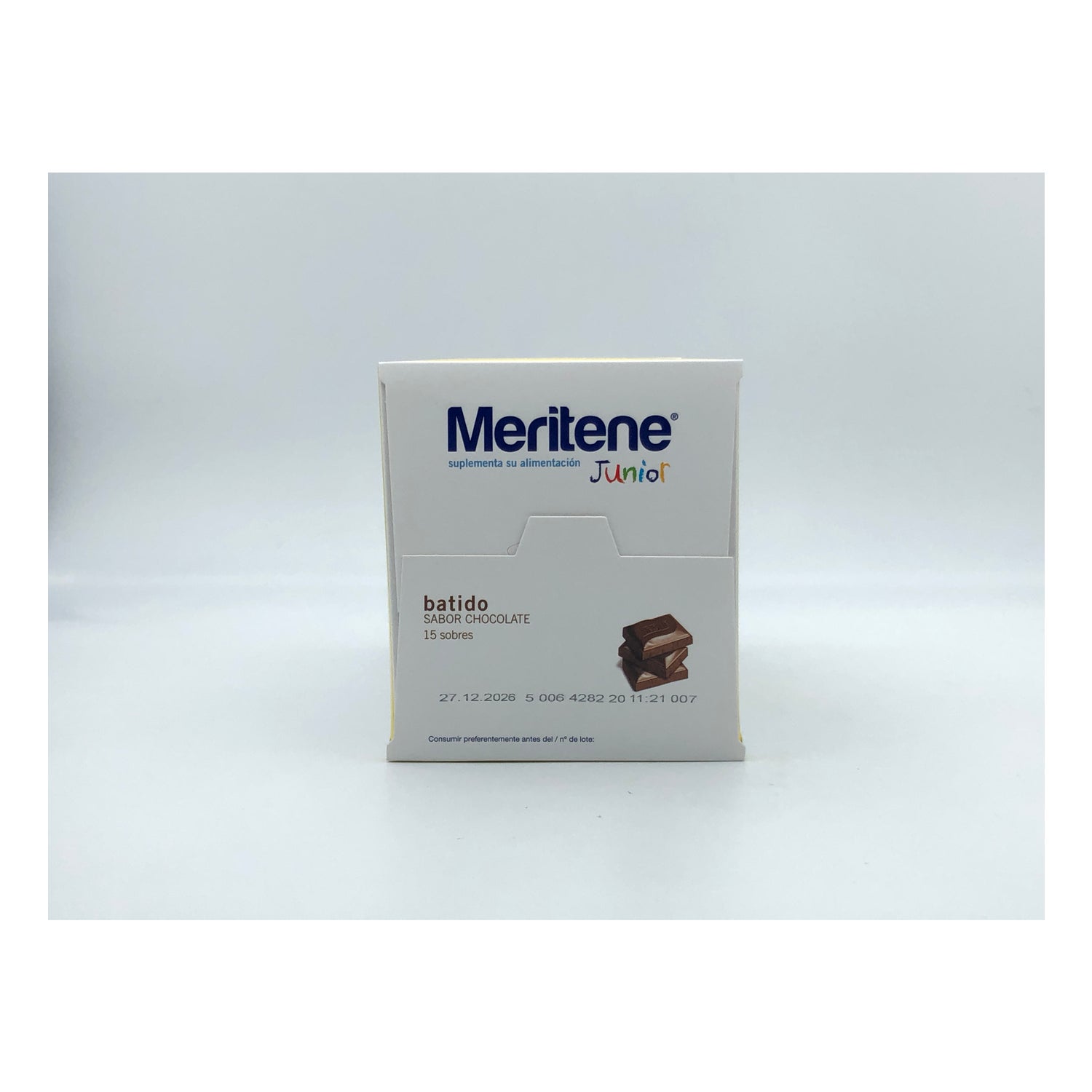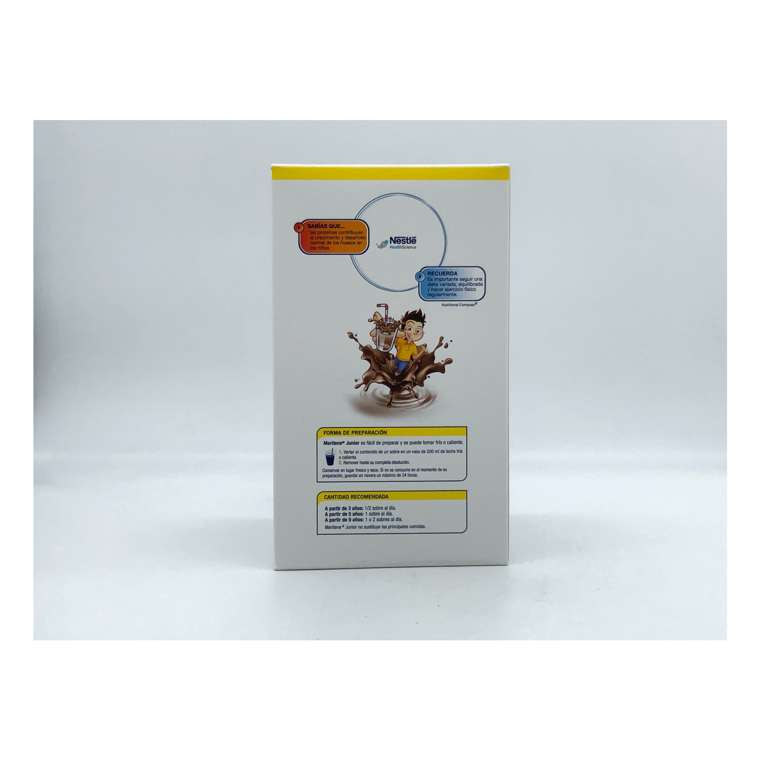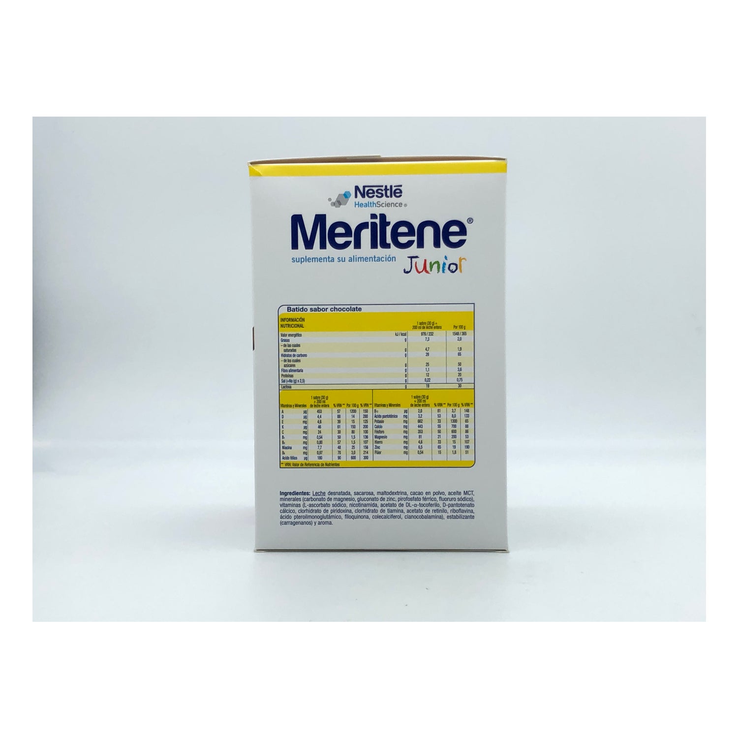 L’integratore in polvere MERITENE Junior al cioccolato contiene proteine del latte, vitamine e minerali per coprire fino a un terzo del fabbisogno giornaliero degli infanti.