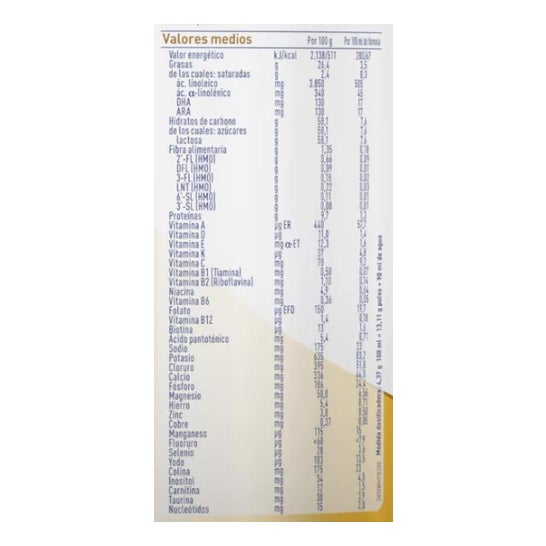 LATTOSIO, OLI VEGETALI (GIRASOLE, COCCO, COLZA E MORTIERELLA ALPINA), PROTEINE DEL SIERO DI LATTE IDROLIZZATE ENZIMATICAMENTE*, SALI MINERALI (FOSFATO DI CALCIO, CLORURO DI MAGNESIO, CLORURO DI POTASSIO, FOSFATO DI POTASSIO, FOSFATO DI POTASSIO, CLORURO DI SODIO, SOLFATO FERROSO, SOLFATO DI ZINCO, SOLFATO RAMEICO, SOLFATO DI MANGANESE, IODURO DI POTASSIO E SELENIUM SELENIDE).FOSFATO DI SODIO, FOSFATO DI POTASSIO, CLORURO DI SODIO, SOLFATO FERROSO, SOLFATO DI ZINCO, SOLFATO RAMEICO, SOLFATO DI MANGANESE, IODURO DI POTASSIO E SELENATO DI SODIO), 2′-O-FUCOSYL-LACTOSE (2'-FL) )(CONTIENE LECHE), LACTO-N-NEOTETRAOSA (LNNT) )(CONTIENE LECHE), ACEITE DE PESCADO, L-ARGININA, L-HISTIDINA, DEXTRINOMALTOSA, COLINA, L-TIROSINA, VITAMINAS (L-ASCORBATO SÓDL-ALFA TOCOFEROLO ACETATO, RETINOLO ACETATO, NICOTINAMIDE, CALCIO D-PANTOTENATO, CALCIO COLECALCIFEROLO, CLORURO DI CALCIO).CALCIO PANTOTENATO, COLECALCIFEROLO, TIAMINA MONONITRATO, RIBOFLAVINA, PIRIDOSSINA CLORIDRATO, FILLOCHINONE, ACIDO FOLICO, D-BIOTINA E CIANOCOBALAMINA), TAURINA, INOSITOLO, L-CARNITINA, NUCLEOL'ENZIMA UTILIZZATO NEL PROCESSO NON CONTENEVA NESSUNO DEGLI ENZIMI (CITIDINA, URIDINA, ADENOSINA E GUANOSINA) E FERMENTI LATTICI (CULTURE DI LACTOBACILLUS REUTERI (DSM 17938**)).