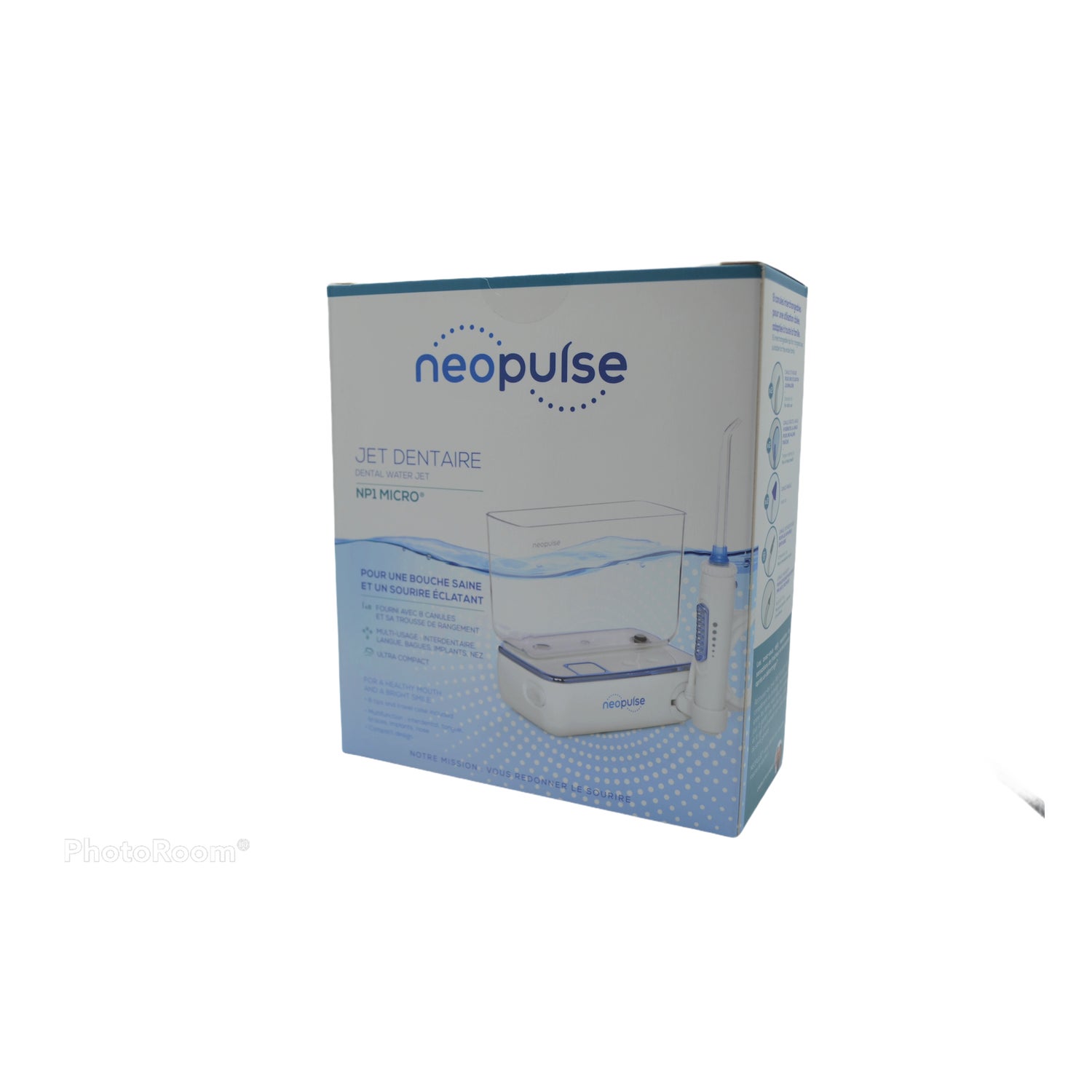 NP1 Micro Neopulse Dental Jet è un getto d'acqua multiuso che pulisce le aree interdentali, la lingua, gli apparecchi, gli impianti e il naso. Grazie all'azione della pressione pulsante dell'acqua, vengono rimossi i residui di cibo e la placca dentale depositati tra i denti e lungo il bordo gengivale. Come complemento allo spazzolino quotidiano, può essere utilizzato anche per la pulizia interdentale, la cura di impianti, ponti o altri apparecchi dentali, il raschiamento della lingua e l'igiene nasale, la prevenzione e la riduzione di carie, tartaro e gengive sanguinanti, la lotta all'alito cattivo, l'eliminazione dei batteri nascosti nelle tasche parodontali e la pulizia accurata di apparecchi dentali e impianti. Inoltre, rafforza le gengive stimolando la circolazione sanguigna, rimuove i batteri dalla lingua e migliora l'igiene nasale. La sua piccola impugnatura lo rende facile da tenere in mano, rendendolo adatto alle persone con problemi di destrezza. Ergonomico, elegante e mobile, questo irrigatore interdentale salvaspazio è facile da portare con sé in viaggio, grazie alla sua custodia.Serbatoio rimovibile da 350 ml e irrigatore regolabile con 5 livelli di potenza da 3,5 a 7 bar. Ultracompatto: 12x7cm.Include 1 getto dentale NP1 Micro + 8 cannule (2 cannule classiche, 2 cannule per il raschiamento della lingua, 2 cannule nasali e 2 cannule specifiche: 1 ortodontica + 1 NeoSoft per impianti dentali) + 1 custodia per il trasporto + 1 cavo USB + 1 libretto di istruzioni.Garanzia di 2 anni e riparabile in seguito nel laboratorio Neopulse in Francia.