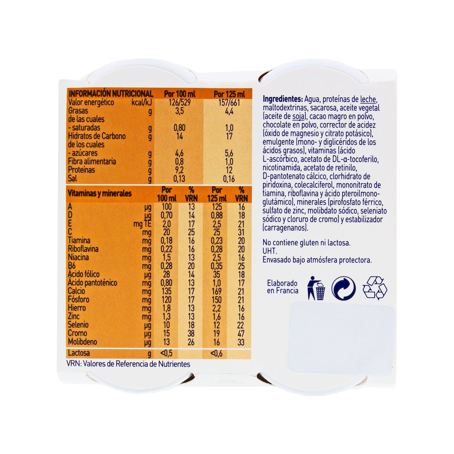 Acqua, proteine del latte, maltodestrine, saccarosio, olio vegetale, minerali (cloruro di potassio, citrato di potassio, ossido di magnesio, pirofosfato ferrico, solfato di zinco, gluconato di kumolibdato di sodio, selenato di sodio, cloruro di cromo e ioduro di potassio), emulsionante (mono- e digliceridi di aacidi grassi), aroma, vitamine (acido l-ascorbico, acetato di dl-alfa-tocoferolo, nicotinammide, acetato di retinile, d-pantotenato di cáciclicolo, piridossina cloridrato, colecalciferolo, tiamina mononitrato, riboflavina, fillochinone, d-biotina, acido pteril-monoglutammico e cianocobalamina), colorante (beta-carotene), acidificante (acido citrico) e stabilizzante (carragenina). Fragola: Acqua, proteine del latte, maltodestrine, saccarosio, olio vegetale, minerali (cloruro di potassio, citrato di potassio, ossido di magnesio, pirofosfato ferrico, solfato di zinco, gluconato di kuacido prico, solfato di manganese, fluoruro di sodio, molibdato di sodio, selenato di sodio, cloruro di cromo e ioduro di potassio), aromi, emulsionanti (mono- e digliceridi degli acidi), aromiacidi grassi), vitamine (acido l-ascorbico, acetato di dl-alfa-tocoferile, nicotinammide, acetato di retinil, d-pantotenato di calcio, cloridrato di piridossina, colecalciferolo, tiamina mononitrato, riboflavina, fillochinone, d-biotina, áacido pteril-monoglutammico e cianocobalamina), colorante (cocciniglia), acidificante (acido citrico) e stabilizzante (carragenina).