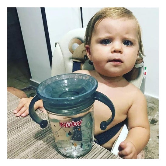 Bicchiere per imparare con manici e sistema anti-goccia. È realizzato in Tritan™, un materiale brevettato resistente, trasparente ed elegante. Inoltre, dispone di una valvola in silicone che permette di bere premendo. Progettato appositamente per facilitare la transizione dal bere da una tazza a un bicchiere.