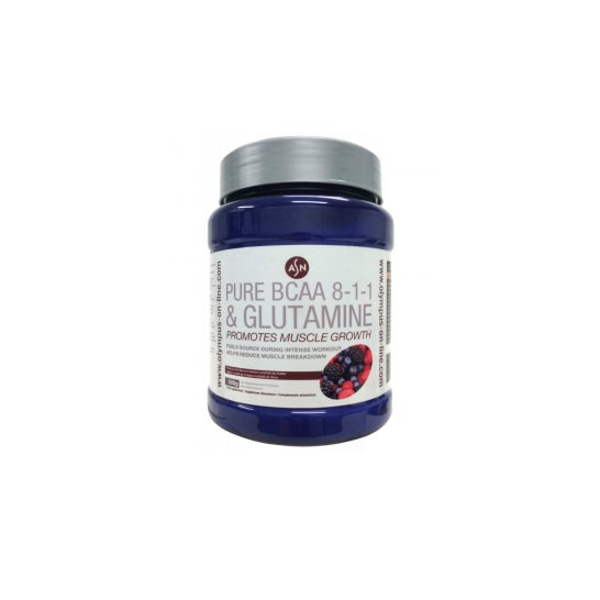 BCAA Pura 8-1-1 con glutamina al gusto di frutti di bosco del marchio ASN che contribuisce all'aumento della crescita muscolare, grazie alla sua formula composta da un elevato contenuto di leucina, aumentando così le prestazioni sportive.