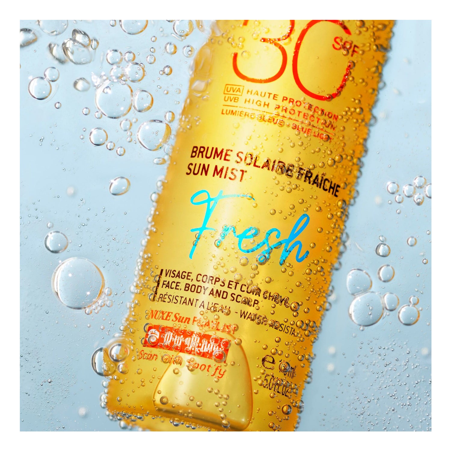 Proteggi viso, corpo e cuoio capelluto con la Bruma Solare Rinfrescante NUXE SPF30: scudo ad ampio spettro, texture ultraleggera e invisibile, idratazione istantanea. Vaporizzatore 360°, resistente all'acqua, fragranza estiva.