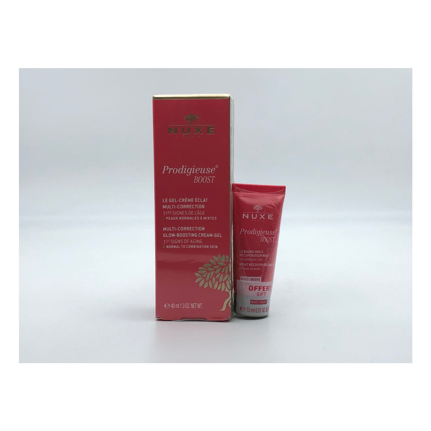 Nuxe Prodigieuse Boost Gel-Cream Luminosity 40ml + Recovery Balm-Oil Night 15ml è un set di prodotti che comprende:
