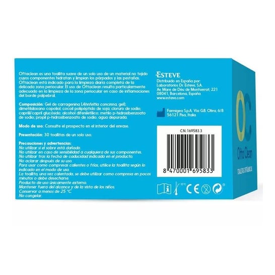Oftaclean Salviette oftalmiche 30 pz. sono salviette sterili, morbide e monouso che aiutano a pulire le palpebre, le ciglia e il margine palpebrale da impurità o particelle esterne che possono essersi accumulate in questa zona durante la giornata.