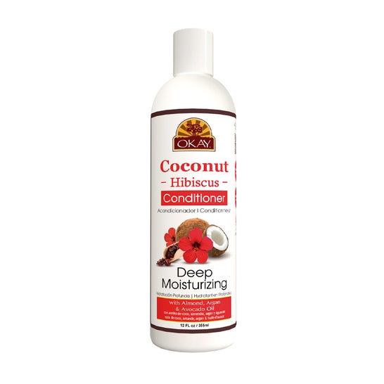 Condizionatore con ibisco e cocco Okay che apporta vigorosità e idratazione ai capelli secchi e fragili. Contribuisce a evitare le punte aperte e il crespo.