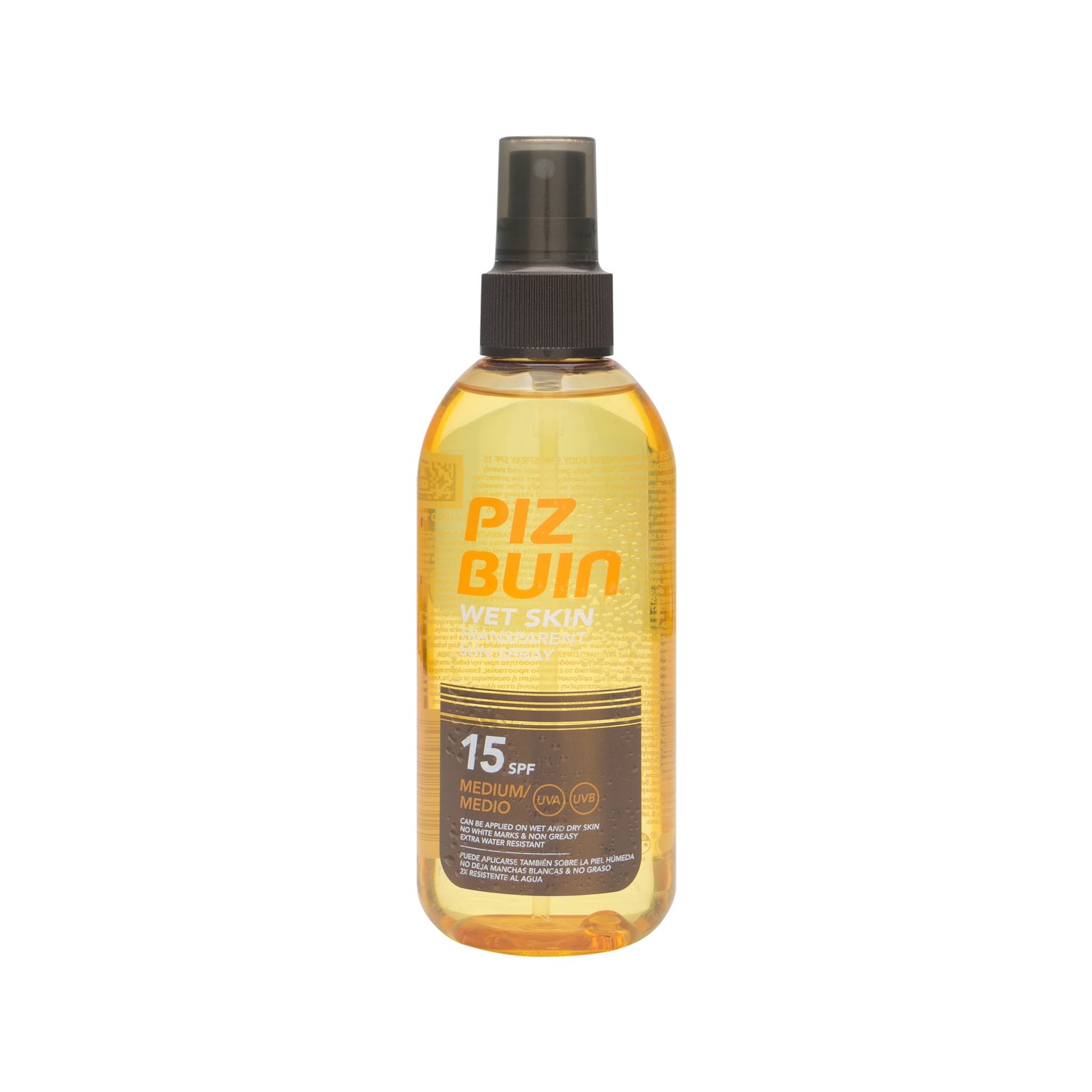 Piz Buin® Wet Skin Oil spray SPF15+ è una crema solare appositamente preparata per migliorare la protezione della pelle anche quando è bagnata. Con la sua applicazione sulla pelle bagnata, il protettore resiste anche ad essere trasparente e non lascia la pelle macchiata di bianco.