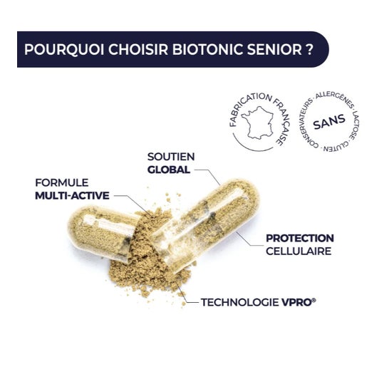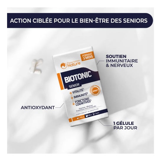Prescription Nature Biotonic Senior 90caps è un complemento completo che combina vitamine, minerali, estratti vegetali e probiotici per supportare la vitalità quotidiana.