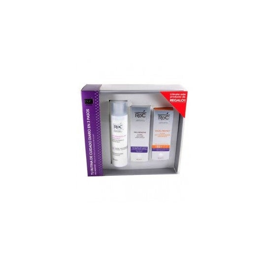 Prenditi cura del tuo viso e ringiovaniscilo, con l'aiuto di ROC e il suo pack anti-invecchiamento, che include: -Roc latte detergente 200ml: è un detergente viso, indicato per le pelli più secche e sensibili. Contiene ingredienti idratanti che ammorbidiscono la pelle per 24 ore, lasciando una piacevole sensazione di benessere sulla tua pelle. Rimuove efficacemente tutte le impurità e i residui trucco dal tuo viso, anche quelli resistenti all'acqua. -Roc fluido antimacchie 40ml: arricchito con vitamina C, corregge i segni dell'invecchiamento della pelle e previene la comparsa di macchie scure sulla pelle. Aiuta a ridurre il rossore, a prevenire i radicali liberi e a stimolare la riparazione del DNA. Roc Pro-Renove Fluido Uniformante da 40 ml: trattamento anti-età per migliorare efficacemente la qualità della tua pelle. Riduce le rughe, migliora il tono della pelle e ne migliora l'aspetto. Combina: hexinol, vitamina C, riflettori di luce, filtri UV, glicerina e burro di karité, per idratare, illuminare, rigenerare e correggere le macchie della pelle. Dai alla tua pelle i trattamenti che merita!