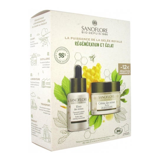 Sanoflore Reines Chest contiene un siero Elixir des Reines da 30 ml e una crema des Reines Riche da 50 ml. Il suo contenuto di pappa reale rigenera e illumina la pelle del viso, in modo organico. La texture della pelle è levigata, la routine è composta al 98% da ingredienti di origine naturale