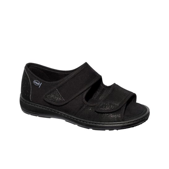 Scarpa anatomica da donna tipo sandalo con tripla chiusura in velcro in nero, caratterizzata da una suola anatomica antiscivolo con un'altezza di 4 cm e una forma arrotondata per evitare inciampi indesiderati. Hanno solette anatomiche che aiutano a distribuire meglio il peso corporeo, e sono specialmente progettate per pazienti con condizioni articolari e cutanee legate a patologie diabetiche, vascolari, reumatologiche, traumatologiche e neurologiche che sono incompatibili con l'uso di calzature commerciali standard.