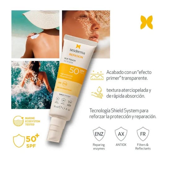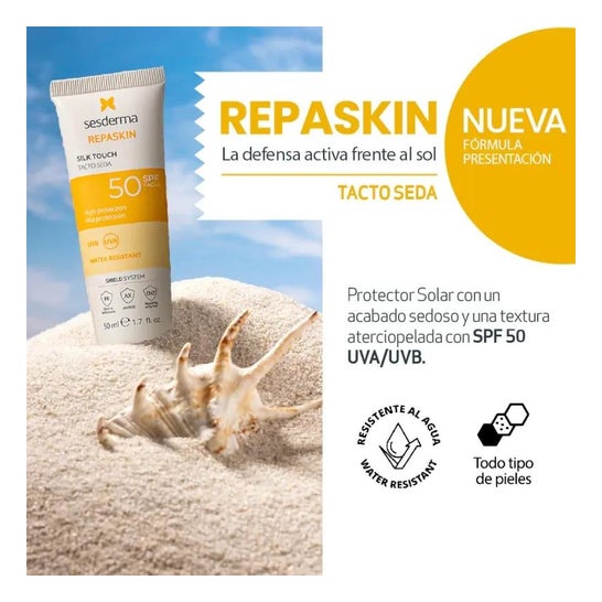 Sesderma Repaskin Fotoprotector Facial Tacto Seda SPF50 50ml è un fotoprotector in formato crema-gel e aiuta a mantenere la pelle protetta e calma mediante la riparazione dei danni al DNA cellulare.