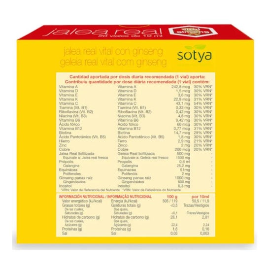 Sotya Vital Royal Jelly with Ginseng Vials 20x10ml pappa reale con ginseng, un prodotto progettato per fornire energia e proprietà stimolanti. agisce come stimolante per il corpo, aumentando la capacità fisica e intellettuale, combattendo l'anemia, migliorando le difese e gli stati di apatia. aiuta a ridurre i livelli di colesterolo. si prende cura della salute delle ossa e dei denti.