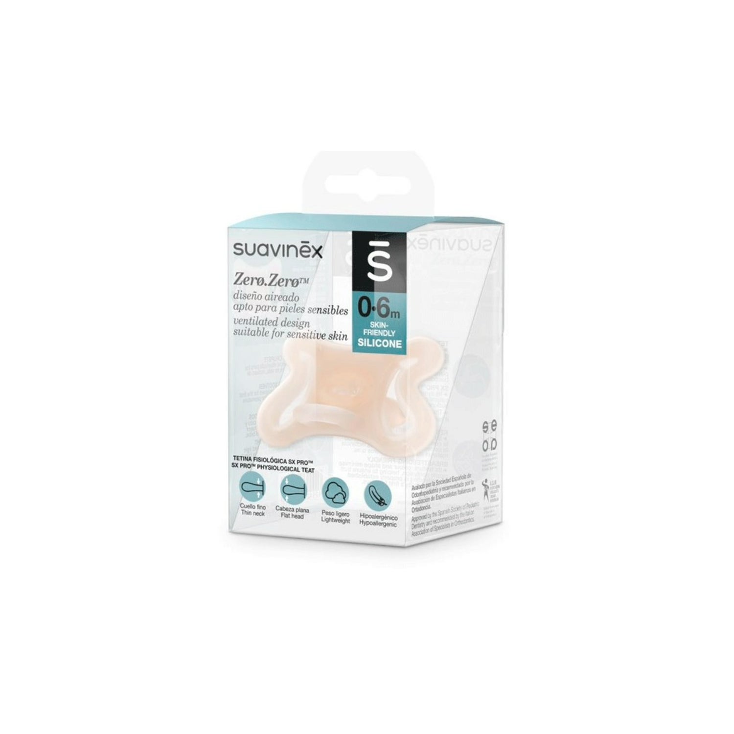 Suavinex Physiological Silicone Soother SX Pro 0-6m 1pc è un succhietto con tettarella fisiologica, appositamente studiato per rispettare lo sviluppo orale e dentale del bambino. Adatto alle pelli sensibili, è realizzato al 100% in silicone di grado medico, che garantisce un tocco molto piacevole per il neonato.