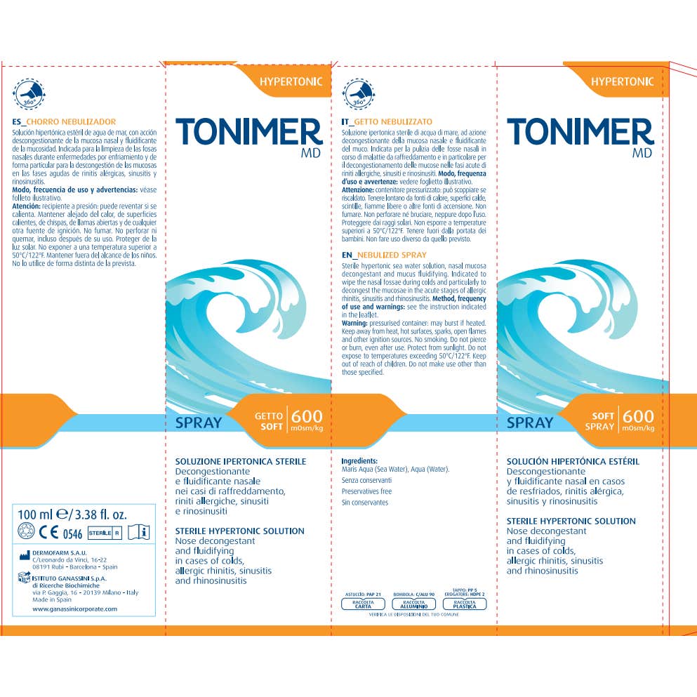 Uso nasale. Uso personale. Non utilizzare il prodotto se il flacone è danneggiato. Non utilizzare il prodotto dopo la data di scadenza. La data di scadenza si riferisce al prodotto integro e correttamente conservato. Non superare la dose raccomandata. In caso di ipersensibilità ai componenti, non utilizzare il prodotto. In rari casi, durante l'uso, può verificarsi un bruciore temporaneo delle mucose o una leggera emorragia nasale che non compromettono la sicurezza né l'efficacia del prodotto. In caso di effetti indesiderati, interrompere l'uso, consultare un medico e informare il produttore. Se i sintomi persistono al termine del trattamento, consultare un medico. Non ci sono controindicazioni relative all'uso del prodotto durante la gravidanza e l'allattamento. Nei neonati, utilizzare il prodotto solo su raccomandazione pediatrica. L'amministrazione di farmaci e prodotti sanitari di tipo inalatorio contemporaneamente a questo prodotto deve avvenire sotto la supervisione di un medico che possa valutare le possibili interazioni. In caso di incidente grave legato all'amministrazione di uno dei prodotti della linea Tonimer Hypertonic Spray, inviare una segnalazione al produttore (customercare@ganassini.it), al Ministero della Salute italiano o all'autorità competente dello Stato membro dell'UE o del paese in cui è stato utilizzato il prodotto. Evitare il contatto con gli occhi; se necessario, sciacquarli con acqua. Tenere il prodotto fuori dalla portata e dalla vista dei bambini. Smaltire il prodotto in modo responsabile dopo l'uso. Conservare chiuso, lontano dal calore, in un luogo fresco e asciutto.
