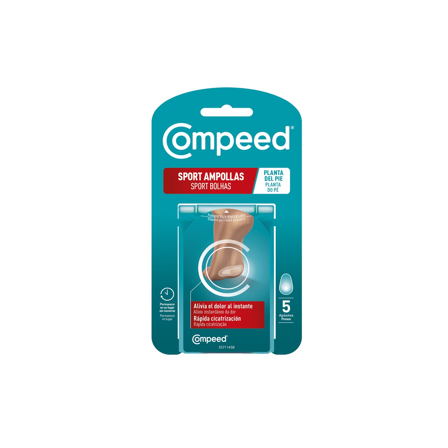 Compeed® Sport Vesciche Plantare 5uds sono cerotti idrocolloidali per le vesciche prodotte durante l'attività fisica. Il loro design si adatta perfettamente alla pianta del piede e, grazie alla loro tecnologia idrocolloidale, assorbono l'eccesso di fluido.