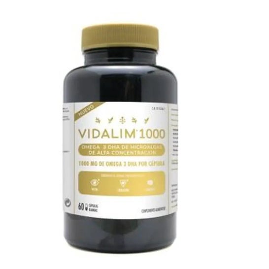 Vidalim 1000mg DHA 60caps è un integratore alimentare che contiene acidi grassi Omega 3 DHA derivati da microalghe, insieme alla Vitamina E, in capsule di gelatina bovina. Ogni capsula fornisce 1000mg di Omega 3 DHA e Vitamina E.