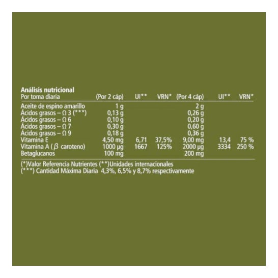 I betaglucani favoriscono il buon funzionamento del tratto gastrointestinale, poiché aiutano a stimolare la microbiota e a modulare la risposta immunitaria contro organismi patogeni. Da parte sua, l'olio di olivello spinoso apporta proprietà idratanti e nutritive che favoriscono la rigenerazione della mucosa intestinale in caso di infiammazione e danno epiteliale.