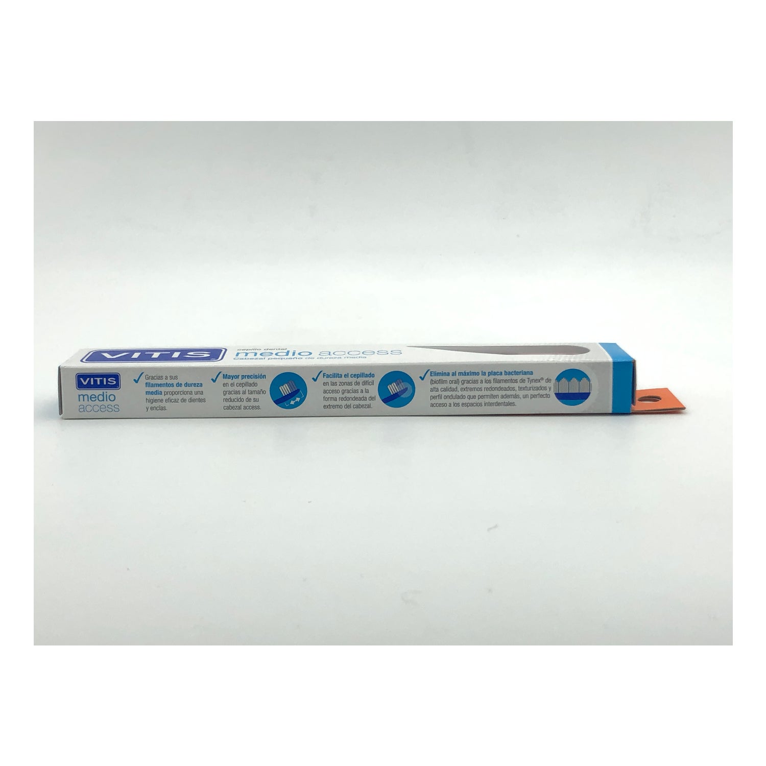 Vitis Medio Access Toothbrush è uno spazzolino che aiuta a eseguire l'igiene dentale quotidiana per adulti, adolescenti e bambini che passano allo spazzolino per adulti.