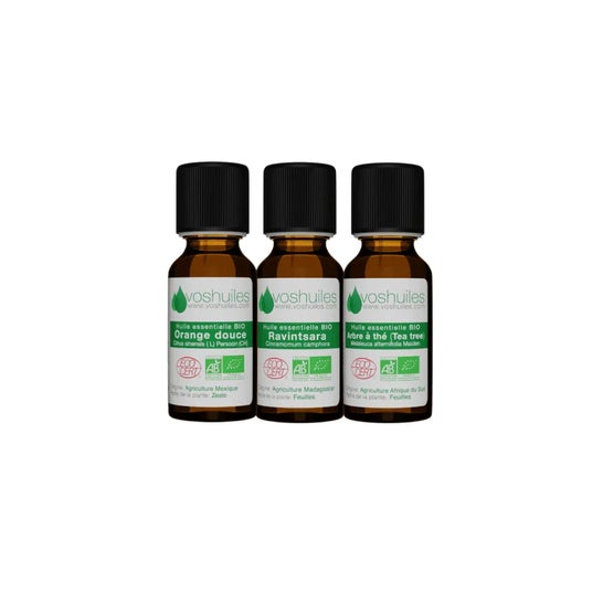 Voshuiles Kit I 3 Oli Essenziali Indispensabili Bio è un insieme essenziale per chi desidera avvicinarsi al mondo dell'aromaterapia. Questo kit include tre flaconi da 10 ml di oli essenziali biologici: